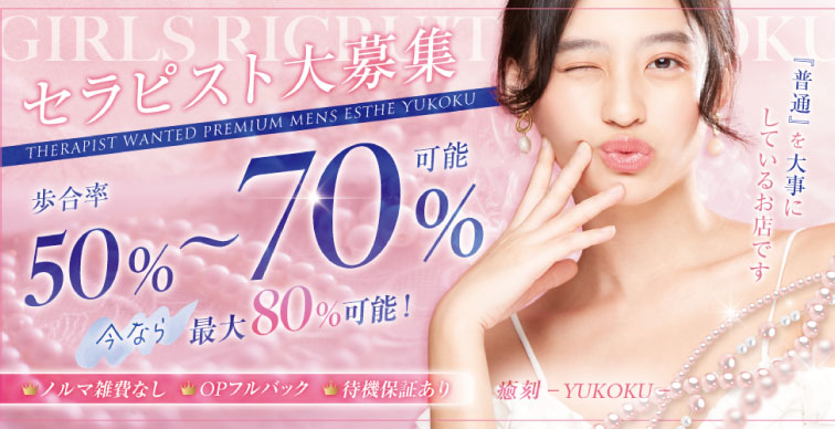 | 当店について | 高収入・未経験歓迎 プレミアムSPA 癒刻(ゆこく)は、 完全健全・高収入・働きやすさを実現した 安心第一のメンズエステ求人です。 |